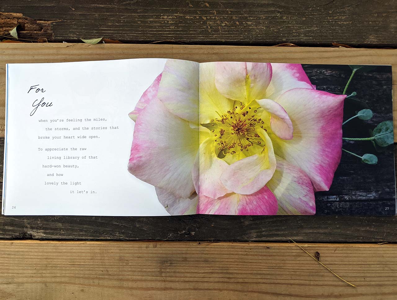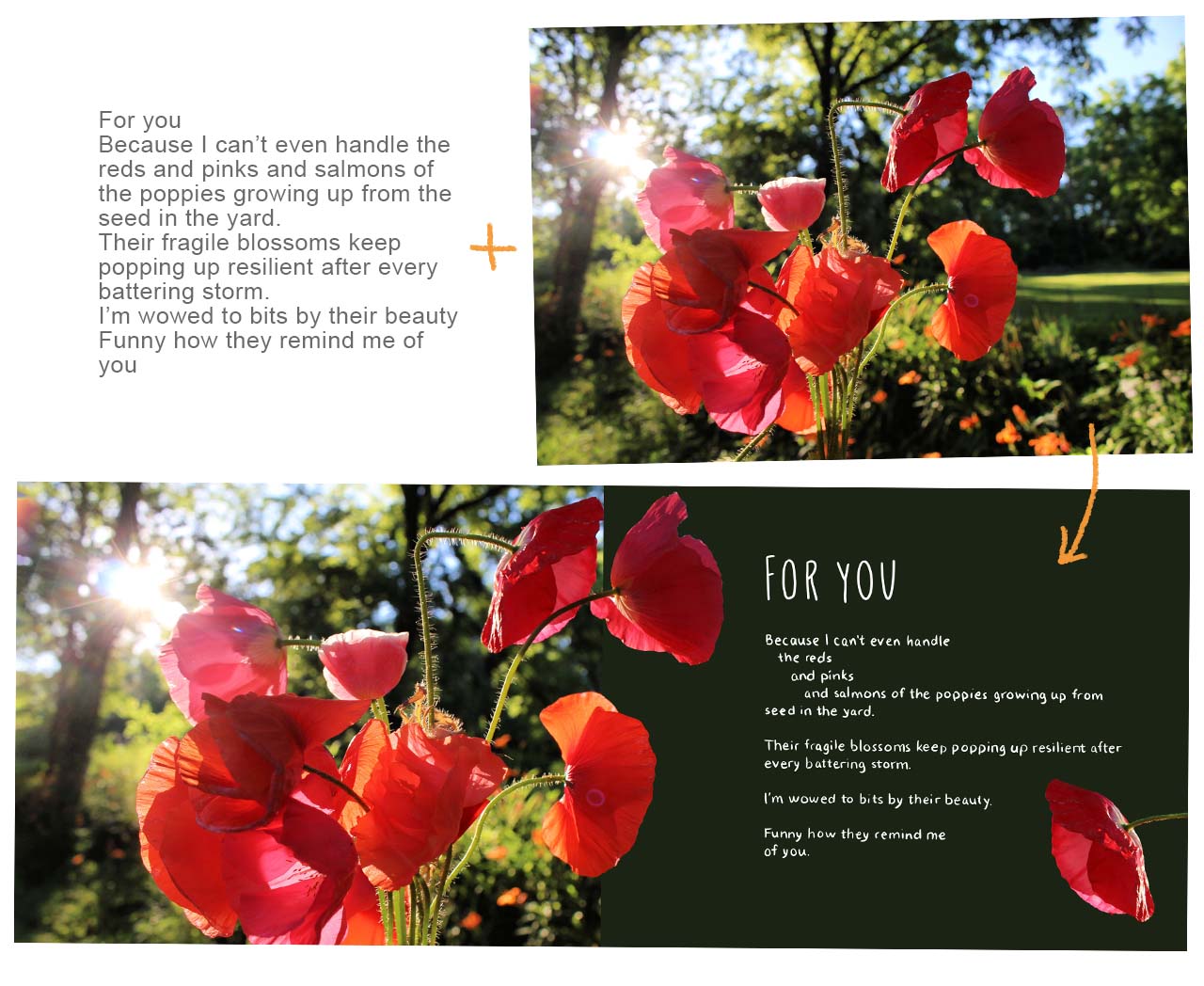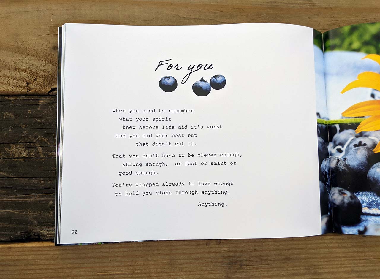 I provided editorial and book design for "Tell Me Something Good, Volume 2," her second published anthology of photography, poetry, and mixed media art. The artist sent me the visual art and poems, which I arranged using InDesign. She gave me freedom to creatively arrange the different elements, as long as the photographs remained the focal point. IĀ isolated portions of the images in Photoshop so I could layer the photos and poetry together, mimicking the layers in her collage work. I also wrote some lettering and poems by hand in Procreate to add variety and lend intimacy to the design.